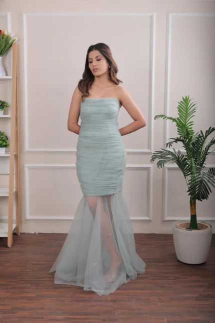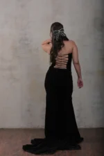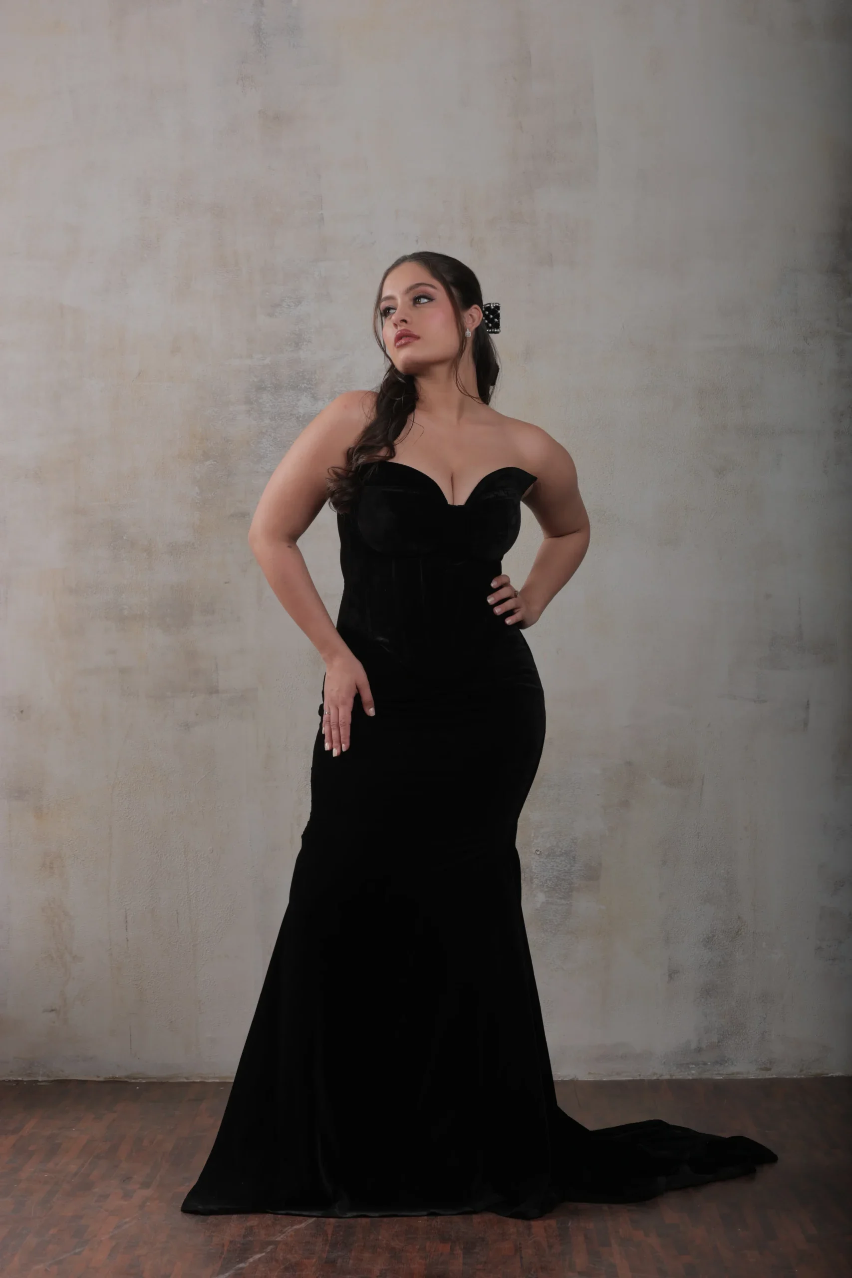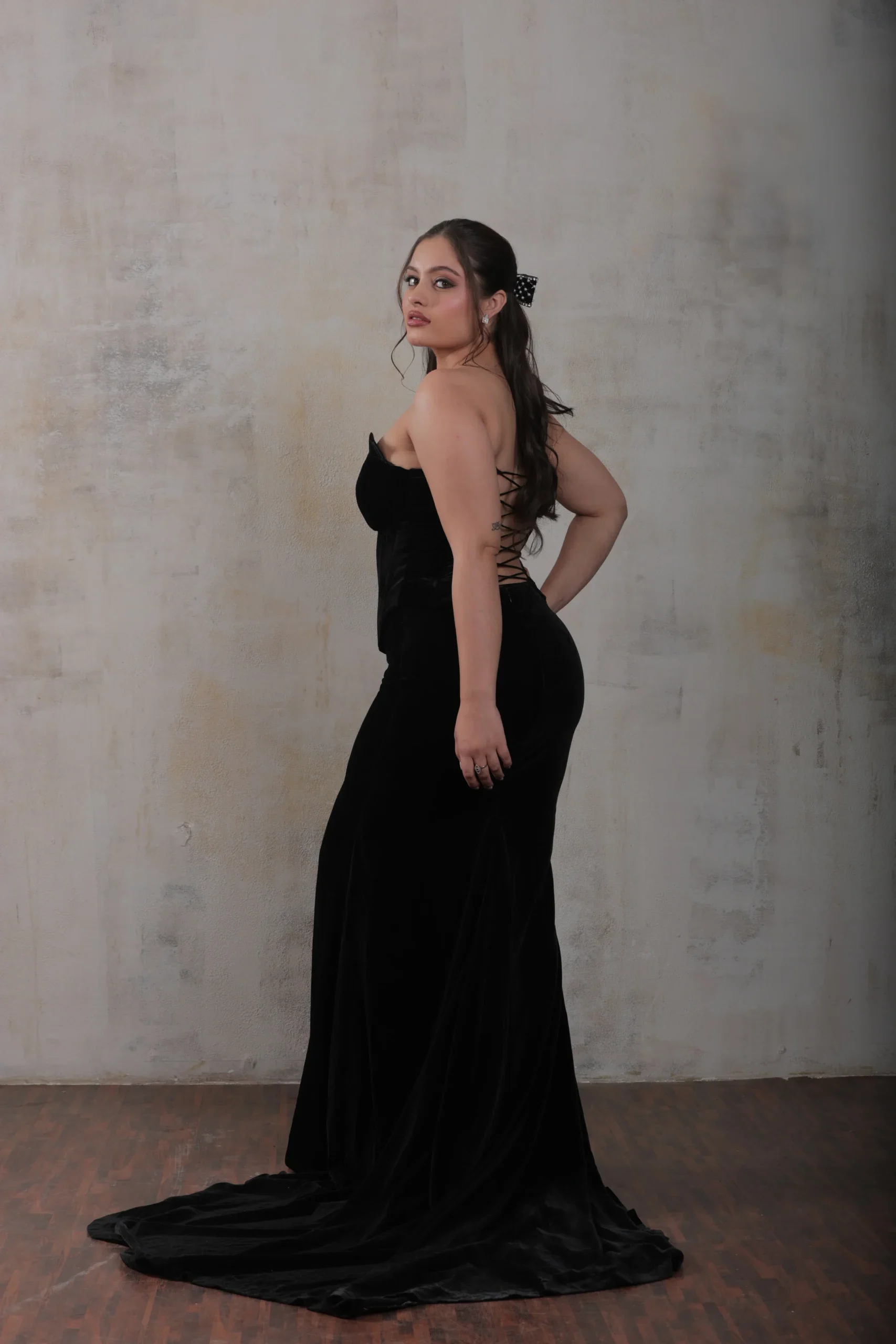 This black velvet corset paired with a long trail skirt is the definition of understated luxury. The sculpted silhouette, rich texture, and timeless black hue make it a perfect choice for evenings that deserve more than ordinary. Think candle-lit dinners, resort soirées, and red-carpet nights , this look was made to own the room.
