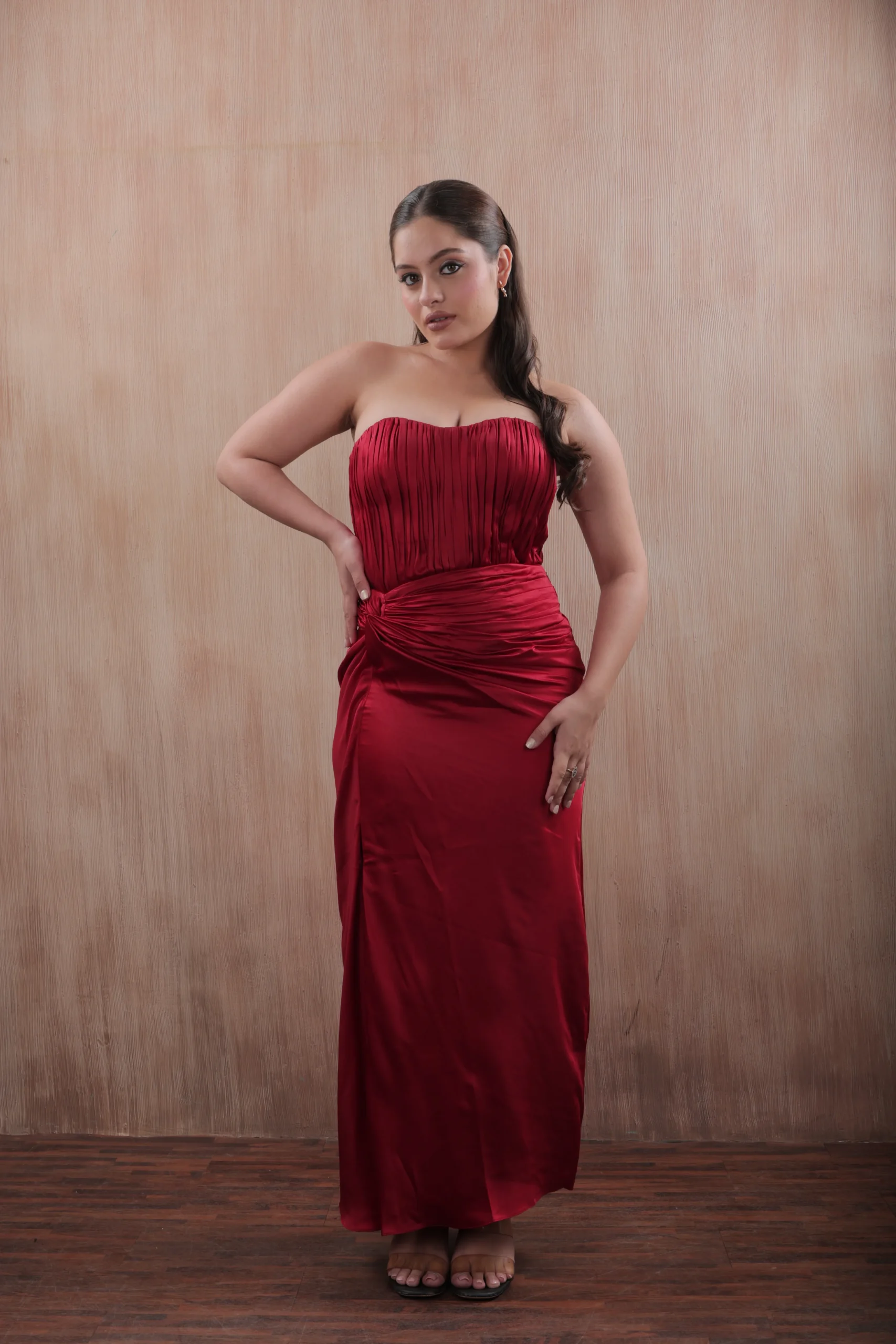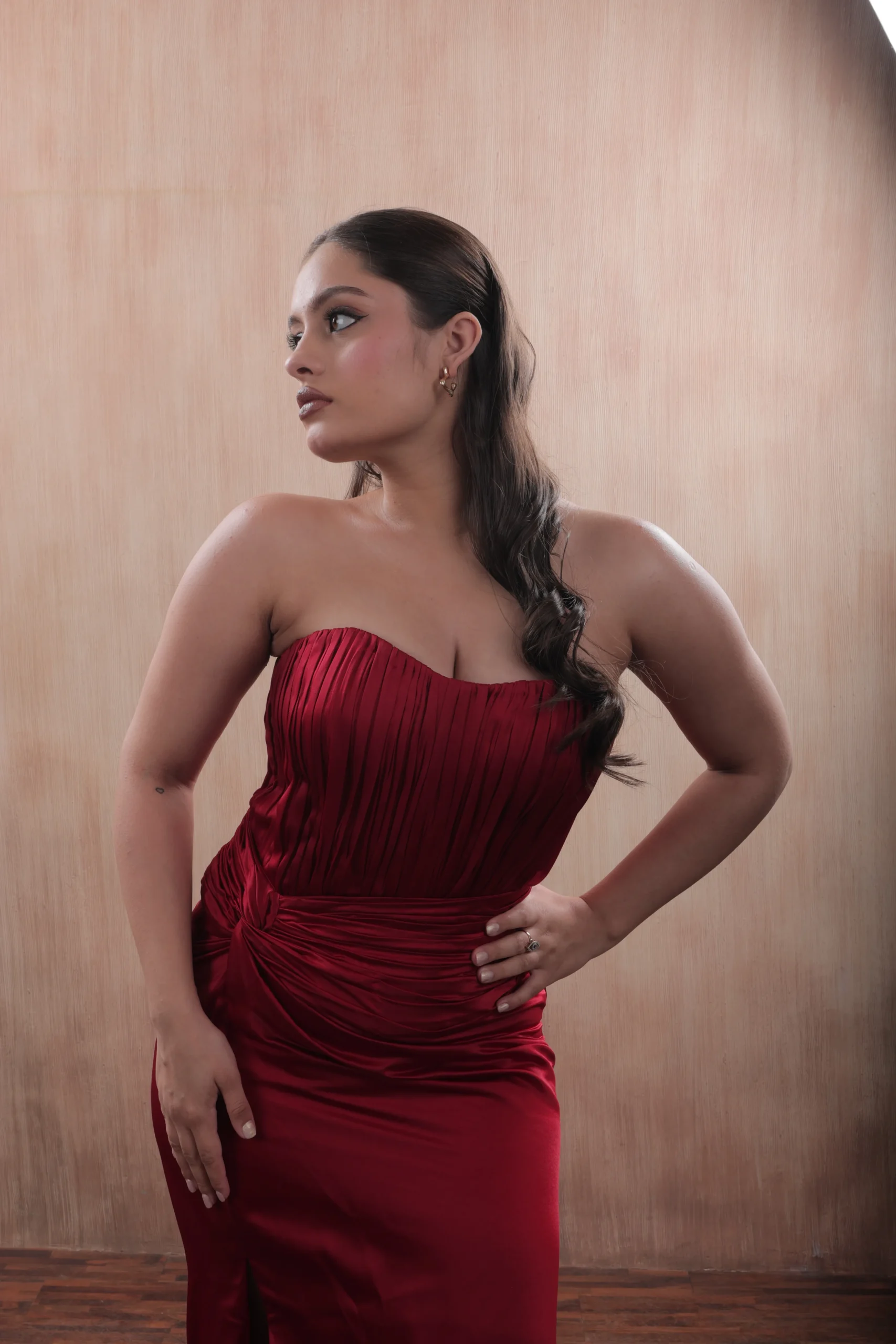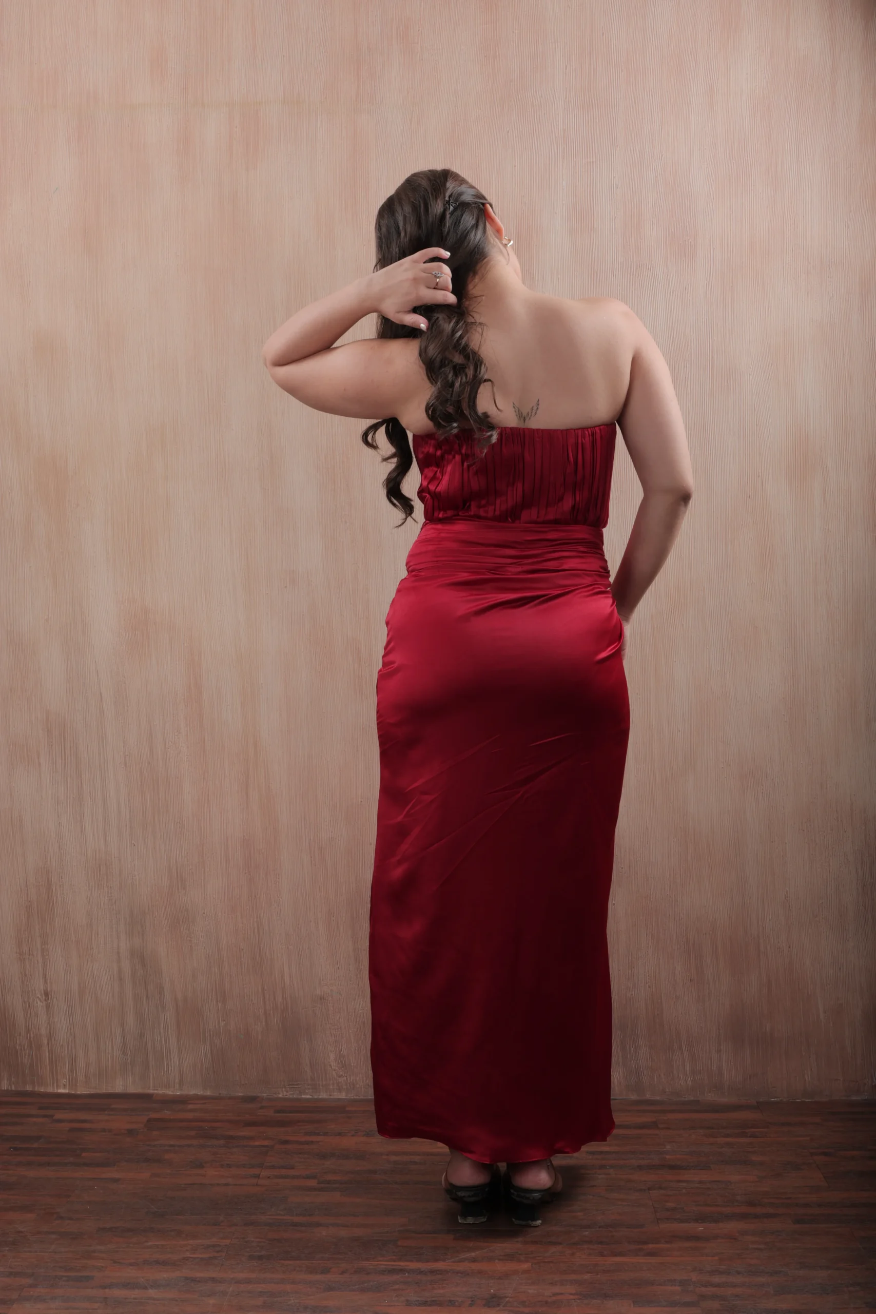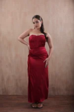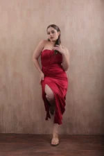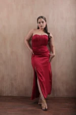 The kind of an outfit that doesn’t just fit, it defines the moment. With a pleated sweetheart bodice, sculpted drape, and a high slit that adds a touch of attitude, this cord – set embodies luxury in its purest form.